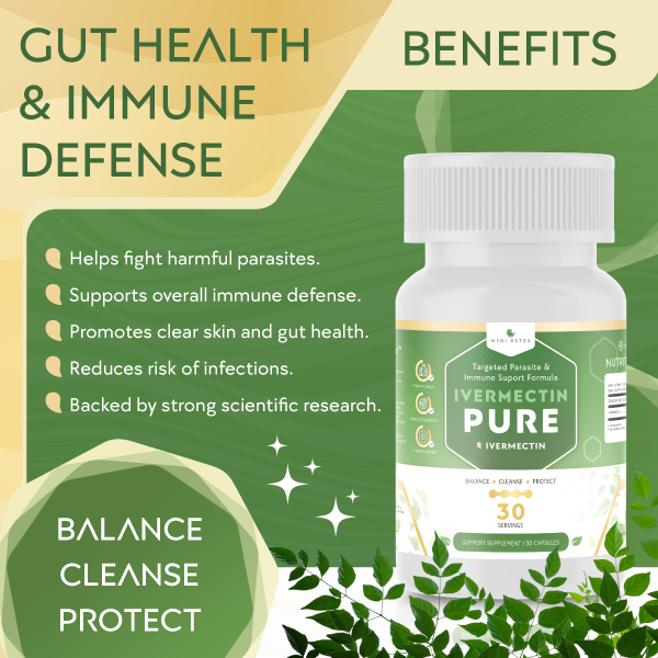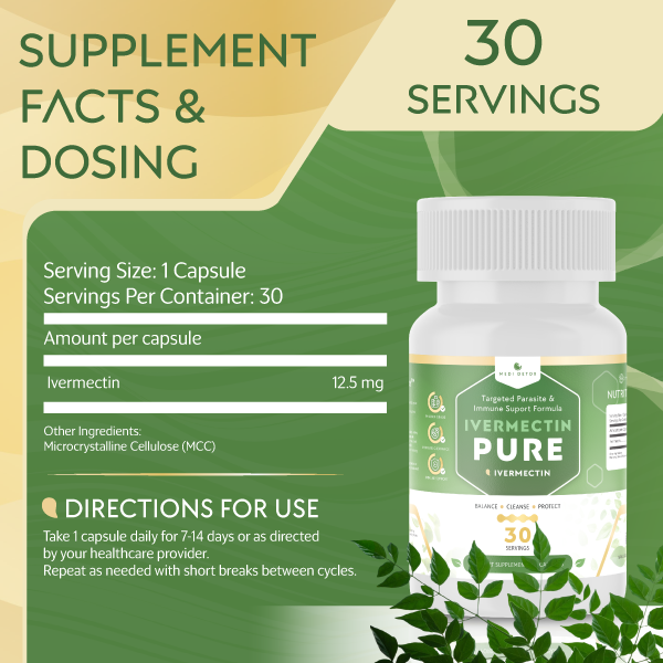 🍃 IvermectinPure™ is a pharma-grade Ivermectin supplement designed to support immune health and aid in clearing various parasites, including pinworms, scabies, and mites. Each capsule contains 12.5 mg of USP-grade Ivermectin, ensuring effective results for parasite management and overall wellness.